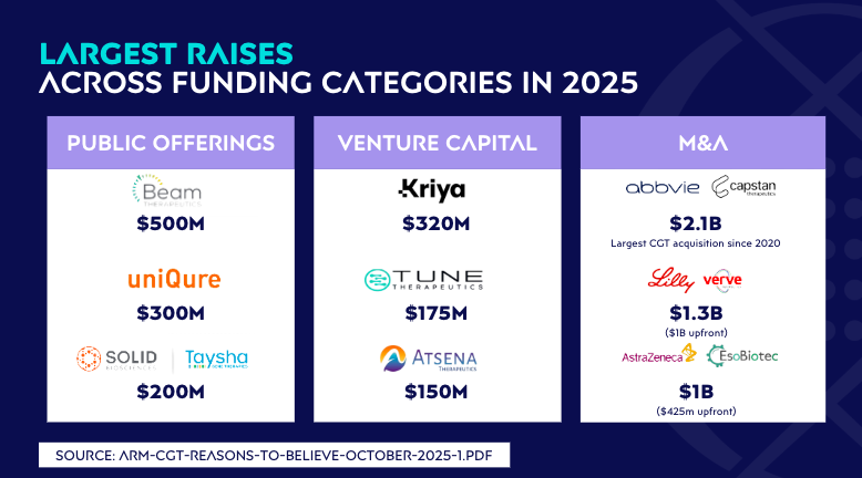 ARM reinforces this trend, with their recent report showing that cell and gene therapy companies are now outperforming the broader biotech market in 2025 after two challenging years. Investors are shifting away from backing single products and are instead directing capital toward platforms and therapeutic areas that can grow and scale.